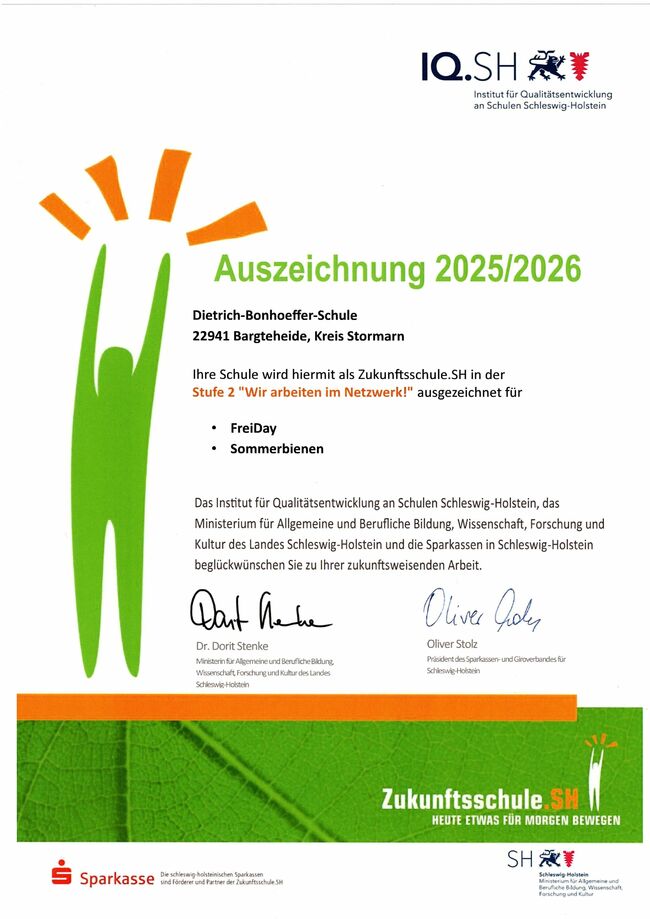 Am 12. Juni 2025 ist die Dietrich-Bonhoeffer-Schule ein weiteres Mal als Zukunftsschule.SH ausgezeichnet worden. Die DBS konnte mit den Projekten FreiDay und Sommerbienen überzeugen. Wir freuen uns über die Anerkennung und wollen unseren Einsatz für Nachhaltigkeit weiter vertiefen. Den dazugehörigen Artikel finden Sie hier.